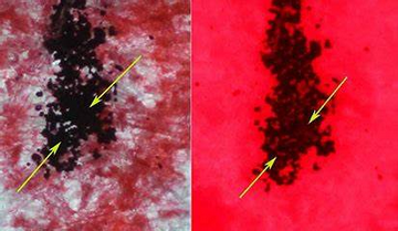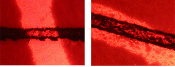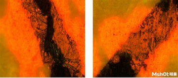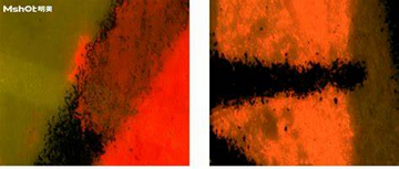 如下圖;左圖為明場透射光的圖片,右圖為熒光圖,對比左右兩圖可以發現,在交叉部位的非孔漏處有熒光,即為先墨后朱。
