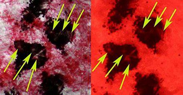 如下圖;左圖為明場透射光的圖片,右圖為熒光圖,對比左右兩圖可以發現,在交叉部位的所有非孔漏處都無熒光,即為先朱后墨。