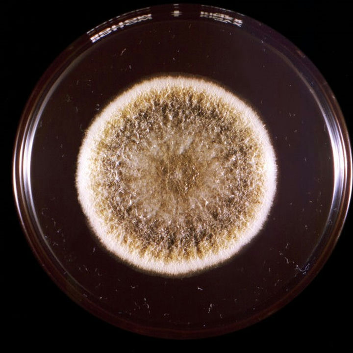培養皿中看到,菌落生長較快,結構疏松,表面灰綠色,背面無色或略呈褐色。