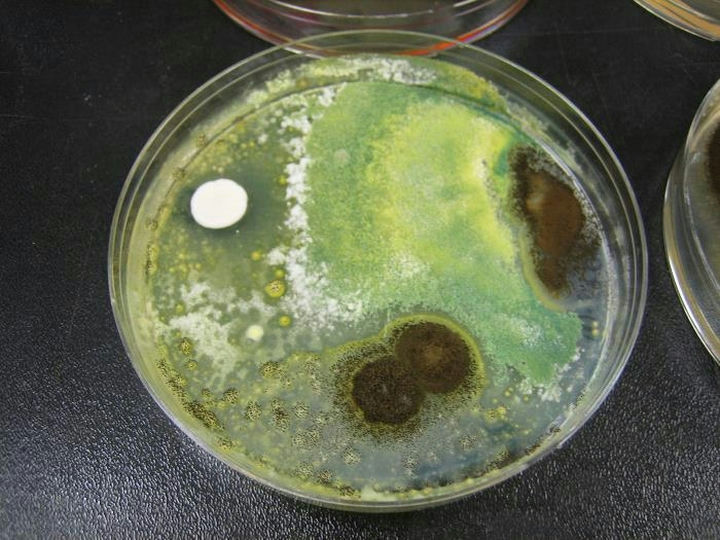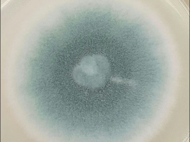 在培養皿中觀察,呈絨狀或絮狀邊緣,暗煙綠色