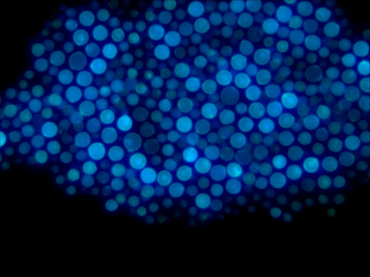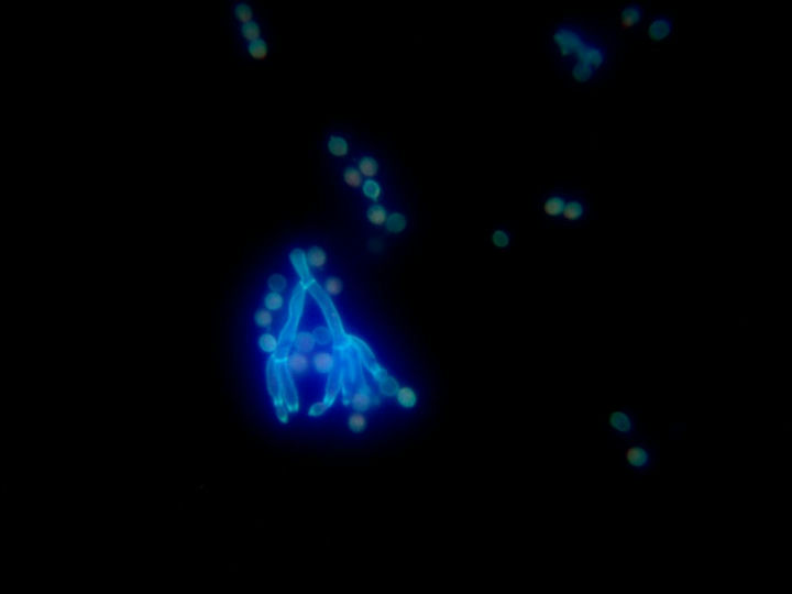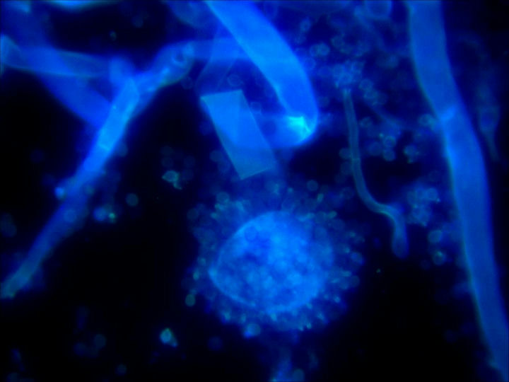 在熒光顯微鏡下,可見“雙異型的45度分支”,菌絲較大,菌體有許多復雜的分枝菌絲構成,紫外激發下有藍色和綠色熒光。