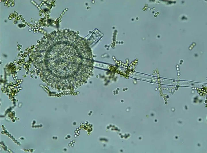 在生物顯微鏡下,分生孢子為球形,菌絲發達,有隔膜和多分枝,頂部形成球形頂囊