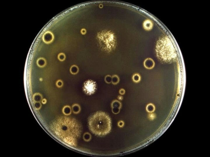在培養皿中觀察,菌落初呈白色,1周后轉淡黃或棕黃、濕潤粘稠,狀似膠汁,因為菌落新舊顏色差異會形成深色主體+淺色外環。