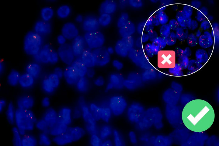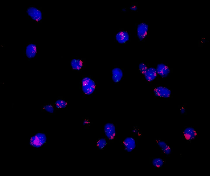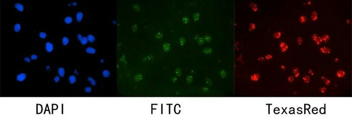 熒光原位雜交(Fluorescence In Situ Hybridization,FISH)是臨床病理檢測中廣泛運用的一種分子細胞遺傳學診斷技術,其原理是用熒光染料直接或間接標記的DNA核酸探針與待測樣本中的DNA核酸序列按照堿基互補配對的原則進行雜交,然后通過熒光顯微鏡觀察熒光信號位置、數量等來判斷待測序列的缺失、擴增及易位等情況。
