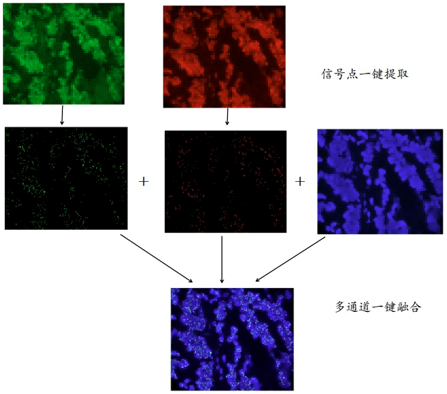 熒光顯微鏡檢做為FISH檢測最后一道關(guān)鍵工序,在推進FISH技術(shù)的進程中扮演著不可或缺的角色。Mshot明美開發(fā)了FISH熒光鏡檢的整套解決方案,這其中包括Mshot明美科研級正置熒光顯微鏡MF43-N以及專用于FISH檢測的醫(yī)學(xué)影像處理軟件系統(tǒng)Mshot V2.0,醫(yī)學(xué)影像處理軟件系統(tǒng)配套了2100萬像素科研級制冷高分辨率、高靈敏度、高特異性的熒光攝像頭,軟件具有自動熒光信號點提取、景深擴展、多通道融合及自由報表等功能,打通FISH樣片熒光檢測—圖像處理—出具報告這條完整產(chǎn)線的應(yīng)用需求。其中強大的自動熒光信號點提取功,可以將提取出的信號點不丟失、亮度不減弱,快速且準確,大大提升了FISH圖像處理效果以及FISH圖像處理效率。以下是FISH熒光信號點一鍵提取功能的效果演示。
